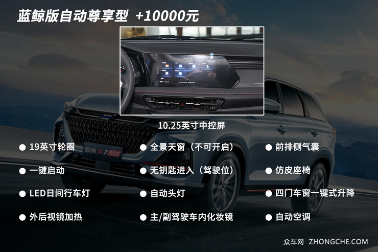 欧尚X7 PLUS自动挡车型共推出了7款,其中蓝鲸版自动豪华型是最入门的版本,其配置与手动豪华型保持了一致,而最主要的区别是换装了一台蓝鲸新一代NE1.5T高功率发动机,上限功率188马力,峰值扭矩达到300牛·米,匹配的是蓝鲸7速湿式双离合变速箱。比手动豪华型贵1万元获得蓝鲸1.5T+7DCT的组合还是比较值的,但其他的配置就较为一般了。推荐指数:★★★